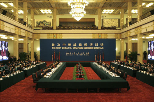 Chinese (L) and U.S. officials face each other during the Strategic Economic
