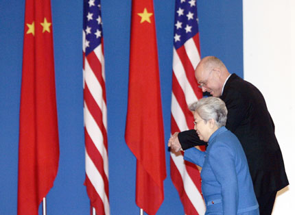 US Treasury Secretary Henry Paulson (R) and China's Vice-Premier Wu Yi hold hands as they arrive for a joint news conference at the Great Hall of People in Beijing December 15, 2006. China will pursue exchange rate reform while the United States will aim to boost national savings in a drive to promote balanced growth, economic policy makers from the two countries agreed on Friday. [Reuters]