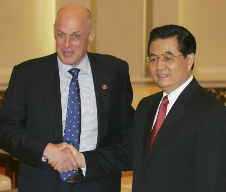 U.S. Treasury Secretary Henry Paulson (L) greets China's President Hu Jintao after the closing of the Strategic Economic Dialogue at the Great Hall of the People in Beijing December 15, 2006. [Reuters]