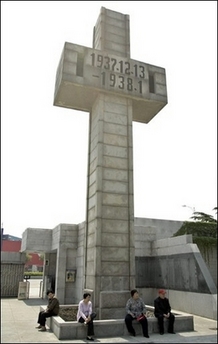 Visitors sit near the Nanjing Massacre Memorial Hall in Nanjing,