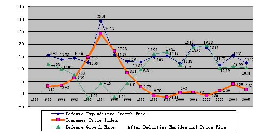 IX. Defense Expenditure Pursuant to the National Defense Law and the Budget Law, and guided by the principle of coordinated development of national defense and the economy, the Chinese government decides on the size and use of defense expenditure in an appropriate way to meet the demands of national defense in keeping with China's economic development. China's defense expenditure mainly comprises expenses for personnel, training and maintenance, and equipment. Personnel expenses mainly cover salaries, insurance, food, clothing, and welfare benefits for officers, non-commissioned officers and enlisted men as well as for civilian employees. Training and maintenance expenses cover troop training, institutional education, construction and maintenance of installations and facilities, and other expenses on routine consumables. The equipment expenses mainly cover research on, experimentation with, and procurement, maintenance, transportation and storage of weaponry and equipment. The defense expenditure covers not only the active forces, but also the militia and reserve forces. Also covered by the defense expenditure are costs to support part of the retired officers, education of servicemen's children and the national economic development, as well as other social expenses. Since the early 1990s, to safeguard its sovereignty, security and unity, and to keep pace with the global revolution in military affairs, China has gradually increased its defense expenditure on the basis of its economic development. This increase, however, is compensatory in nature, and is designed to enhance the originally weak defense foundation. It is a moderate increase in step with China's national economic development. In the 1980s, China began to shift the focus of its work to economic development. At that time, it was decided that national defense should be both subordinated to and serve the country's overall economic development. As a result, national defense received a low input, and was in a state of self-preservation. From 1979 to 1989, the average annual increase of defense expenditure was 1.23 percent. However, the defense expenditure actually registered an average annual decrease of 5.83 percent, given the 7.49 percent average annual increase of the consumer price index in the same period. From 1990 to 2005, the average annual increase in defense expenditure was 15.36 percent. As the average annual increase of the consumer price index during the same period was 5.22 percent, the actual average increase in defense expenditure was 9.64 percent. Chart 1: Comparison Between the Growth Rate of China's Defense Expenditure