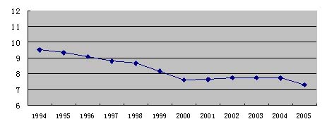 and the National Residential Consumer Price Index (1989-2005) China's GDP in 2004 and 2005 was RMB15,987.8 billion and RMB18,308.5 billion, respectively, with a growth rate of 10.1 percent in 2004 and of 10.2 percent in 2005. The state financial expenditure was RMB2,848.689 billion in 2004 and RMB3,393.028 billion in 2005, up 15.57 percent and 19.11 percent respectively over the previous year. China's defense expenditure in 2004 and 2005 was RMB220.001 billion and RMB247.496 billion, respectively, with growth rates of 15.31 percent and 12.50 percent. In the past two years, the share of China's annual defense expenditure in its GDP and in the state financial expenditure in the same period has decreased, being 1.40 percent and 7.74 percent respectively in 2003, 1.38 percent and 7.72 percent in 2004, and 1.35 percent and 7.29 percent in 2005. Its defense budget for 2006 is RMB283.829 billion. Chart 2: Share of China's Annual Defense Expenditure in the State Financial Expenditure (1994-2005) (%)
