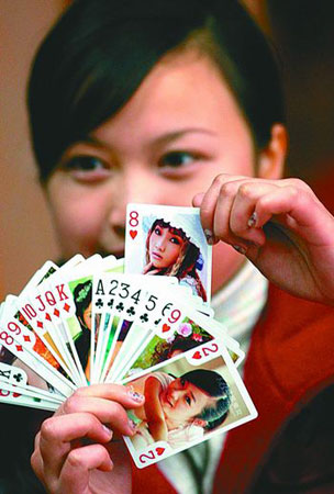 Train attendant Yu Jingji, 18, shows playing cards printed