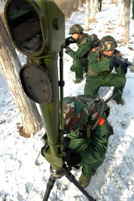 Anti-terrorism drill in Yinchuan(Xinhua)Updated: 2007-01-04 22:49 An armed policeman places facilities as the other two take aim