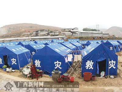 Over 90 temporary houses and tents have been set up for local residents displaced after the ground of their village started sinking on December 29, 2006. [Photo: gxnews.com.cn]