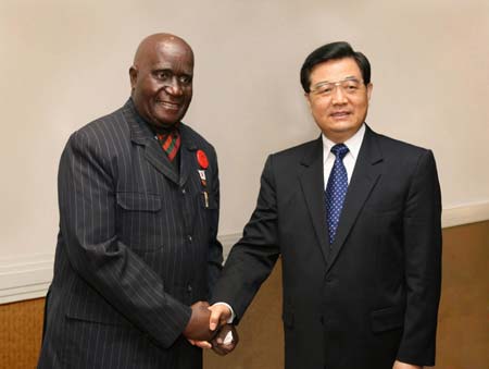 Chinese President Hu Jintao (R) shakes hands with former Zambian president Kenneth Kaunda in Lusaka February 4, 2007.[Xinhua]