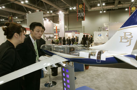 Visitors examine a model of a Boeing 737-700 business jet displayed at the Asian Business Aviation Conference & Exhibition 'ABACE 2007' in Hong Kong February 6, 2007.[Reuters]