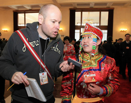 An echnic minority delegate receives an interview with a journalist as they enters the Great Hall of the People for the opening of the National People's Congress in Beijing March 5, 2007. [Xinhua]