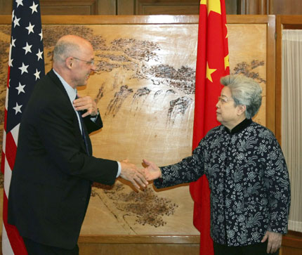 Chinese Vice Premier Wu Yi (R) shakes hands with US Treasury Secretary Henry Paulson during a meeting at Beijing airport March 7, 2007. Paulson, on his third China trip in seven months, is to prepare for the second round of China-US Strategic Economic Dialogue due to be held in May in Washington and to be co-chaired by Wu and Paulson. [Reuters]