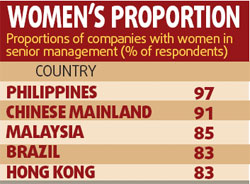In the Philippines, 97 percent companies have women holding senior positions. "The findings suggest that China businesses focus on capability and performance when appointing senior management, and not on gender," said Alison Wong, partner of specialist advisory services at Grant Thornton. On average 65 percent of the companies in the world have women in senior management positions, the survey shows. China is ahead of many Western countries, including the US, Canada and Britain. "Despite some people's perception about traditional gender bias in Chinese society, it is positive to note that today three places across two shores achieve such a high proportion of business with senior females," Wong said. Almost all Asian countries have more businesses with women at senior levels than the global average, except Japan, whose rate is only 25 percent. "Obviously Japan is unique in the cultural perception about women in business and women's role in the family as compared with other parts of Asia, " Wong said. The survey reflects an upward trend in the percentage of women in management roles in most economies, but only the Philippines has achieved true parity in male/female management. "Hopefully we will see similar equality in other places in the coming years as more women play increasingly prominent roles in public life," Wong said, citing names such as Vice-Premier Wu Yi, and Zhang Yin, chairman of Nine Dragons Paper Holdings and the first woman to top the list of China's richest people with a fortune of $3.4 billion.