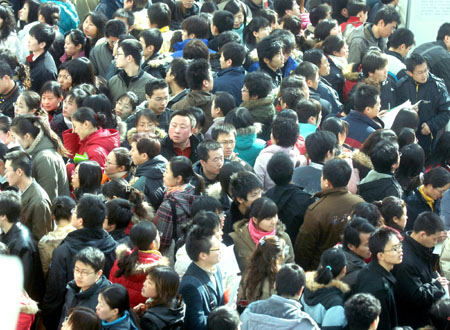 Job seekers flood a job fair in Shenyang, northeast China's Liaoning Province March 10, 2007. About 300 employers participated in the spring job fair especially for graduates, providing more than 5,000 vacancies. [Xinhua]