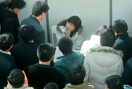 Job seekers inquire about the vacacies at a job fair in Shenyang, east China's Liaoning Province March 10, 2007. About 300 employers participated in the spring job fair especially for graduates, providing more than 5,000 vacancies. [Xinhua]