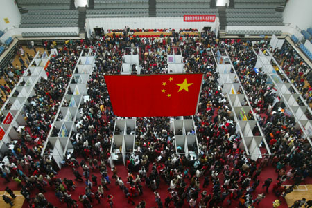 Graduates check for vacancies at a job fair inside a university in Wuhan, central China's Hubei province March 10, 2007. [newsphoto]