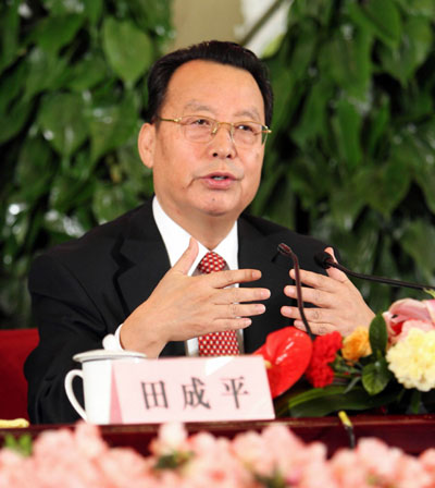 Tian Chengping, minister of Labor and Social Security, talks as he met the press Tuesday on the sidelines of the National People's Congress March 13, 2007. China is still facing a tough employment task this year, given the emergence of more laid-off workers and new job-seekers, said Tian. [Xinhua]