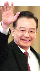 Premier Wen Jiabao waves to the media after Friday's closing ceremony