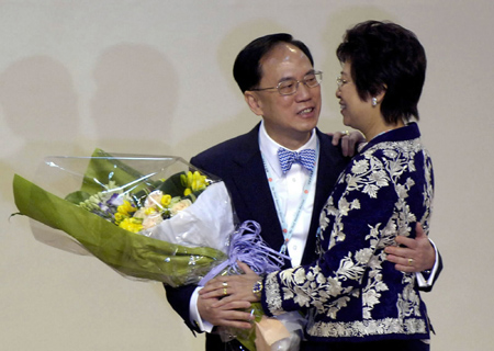 Tsang receives flowers from his wife Selina at the podium after Tsang won