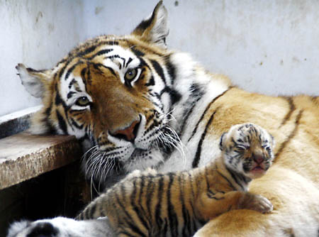 A Siberian Tiger and one of her cubs rest at their enclosure at the Siberian Tiger Forest Park in northeast China's Heilongjiang Province, April 23, 2007. More than 100 tiger cubs are expected to be born in this park this year. [Xinhua]