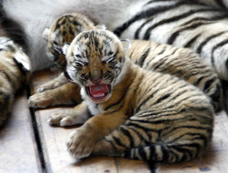 Siberian Tiger cubs are seen at their enclosure in the Siberian Tiger Forest Park in northeast China's Heilongjiang Province, April 23, 2007. More than 100 tiger cubs are expected to be born in this park this year. [Xinhua]