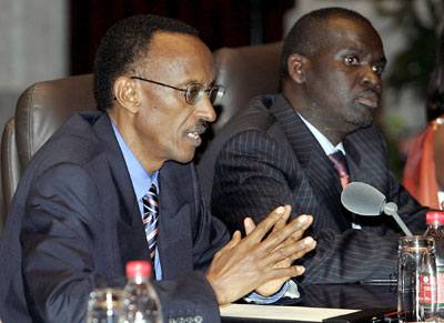 Rwanda's President Paul Kagame (L) speaks during a bilateral meeting with Chinese Premier Wen Jiabao in Shanghai May 15, 2007. [Reuters]