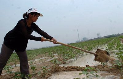 A woman works tries to protect the crop seedlings in her field in Yuncheng, north China's Shanxi Province Tuesday. The Ministry of Agriculture (MOA) warned Friday the lingering drought will damage the year's summer crop output, but analysts say the country's grain crop prices won't be much affected. [Xinhua]