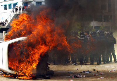 'Terrorists' set a wagon ablaze during an anti-terrorism drill as part of efforts to maintain security in Guiyang, Southwest China's Guizhou Province May 22, 2007. [Newsphoto]
