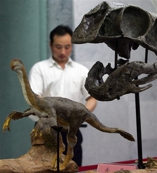 Fossilized bones uncovered in the Erlian Basin of northern China's Inner Mongolia region show that the specimen was about 26 feet long, 16 feet tall and weighed 3,000 pounds, said Xu Xing, a paleontologist at the Institute of Vertebrate Paleontology & Paleoanthropology in Beijing. The height is comparable to the meat-eating tyrannosaurs. But the dinosaur, called Gigantoraptor elrianensis, also had a beak and slender legs and likely had feathers. It was 35 times larger than its likely close relation, the Caudiperyx, a small, feathered dinosaur species, Xu said. That puts the Gigantoraptor's existence at odds with prevailing theories that dinosaurs became smaller as they evolved into birds and that bigger dinosaurs had less birdlike characteristics, he said. "This is like having a mouse that is the size of a horse or cow," said Xu, who co-authored a paper on the finding published Thursday in the journal Nature. "It is very important information for us in our efforts to trace the evolution process of dinosaurs to birds. It's more complicated than we imagined." The Caudiperyx and the Gigantoraptor belong to a group of dinosaurs called oviraptors, which tend to be human-sized or smaller. In recent years paleontologists have found turkey-sized, feathered representatives of the group, but they have never found anything close to the scale of Gigantoraptor. "It's one of the last groups of dinosaurs that we would expect to be that big," said Mark Norell, curator of paleontology at the American Museum of Natural History in New York City. But Philip Currie, a paleontologist at the University of Alberta, said the size of the Gigantoraptor would be a natural step in the evolutionary process of the oviraptors. "Almost every group that has evolved has tended to evolve giant forms," Currie said. Animals tend to become bigger with evolution because larger creatures have an easier time getting food, impressing potential mates and avoiding predators. But size has disadvantages, too. Bigger animals need more food and territory. They have fewer offspring and reproduce less frequently than smaller animals do. That means they are particularly vulnerable when environmental conditions change, as they abruptly did about 65 million years ago. Just a few million years after Gigantoraptor evolved, it and every other dinosaur species on Earth became extinct. On Wednesday, reporters were given a look at the Gigantoraptor's remains — two yellowing, rough-edged leg bones both a little over 3.2 feet long and believed to be those of a young adult. It has not been determined whether the Gigantoraptor was a herbivore, which have small heads and long necks, or a carnivore, which have sharp claws. The dinosaur has both, Xu said. Xu and his team, which discovered three other specimens in the fossil-rich Erlian Basin, were being interviewed by Japanese media in 2005 when they discovered the Gigantoraptor remains. They had chosen a random site to illustrate how one of the previous fossils had been discovered and hit upon a bone while on camera, Xu said. The team originally thought that it belonged to a tyrannosaur because of its size, but realized upon examination that it was an oviraptor. "It was an unexpected finding," Xu said. |