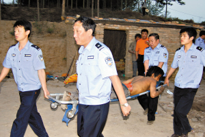 Policemen carry a rural migrant laborer with a stretch who has just been rescued from a kiln in Caosheng Village, Hongdong County in Shanxi Province in this undated photo. [Guangzhou Daily/file]