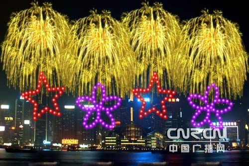 An artist's impression of the fireworks display to celebrate the tenth anniversary of Hong Kong's return to Chiha is released on the CNR website. The fireworks will be lit beside the Victoria Harbor in Hong Kong on the night of July 1. [cnr.cn]