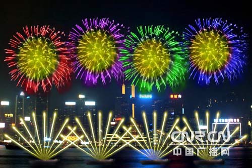 An artist's impression of the fireworks display to celebrate the tenth anniversary of Hong Kong's return to Chiha is released on the CNR website. The fireworks will be lit beside the Victoria Harbor in Hong Kong on the night of July 1. [cnr.cn]