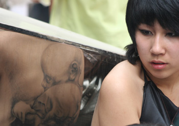 A 27 year-old man surnamed Wang openly showed off his torso with his arms and back covered in tattoos. He wore army pants, wore a gold necklace and had a ring that pierced his lip. He said he was only 17 when he had his first tattoo, a black swirl of thorns on his left shoulder. Wang talked with his friends who also had tattoos, and he was friendly to those who touched his tattoos or asked for taking photos. Wang also admitted his parents were against him having a tattoo at first but gradually they accepted his choice. Now, Wang's arms, chest, and back are tattooed with different designs. A design of dragon on his left arm was finished after 30 hours and the tattoo cost 8,000 yuan (more than US$1,000), said Wang. A girl Tian Tian, 19, had her back tattooed with two evil-looking bald heads