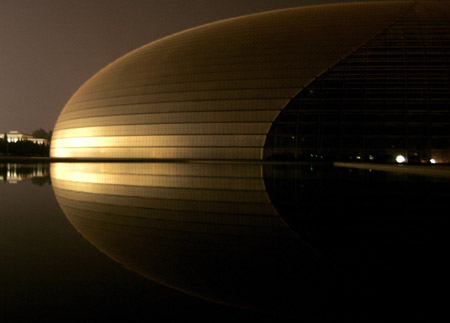 A general view shows the "National Grand Theater" as water fills its surroundings at night in Beijing June 16, 2007. Construction of the theatre will be completed in September, and the first performance is scheduled for October 1, the National Day. [Reuters] |