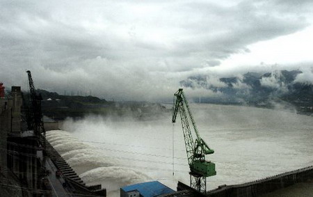 Flood water is discharged through the sluice on the Three Gorges Dam on June 19, 2007. Continuous downpour on the upper reaches of the Yangtze River has resulted in this year's heaviest flood, with 3,3000 cubic meters of water flowing into the Three Gorges Reservior every second. The 2007 plan for flood prevention and control has been implemented. [Xinhua]