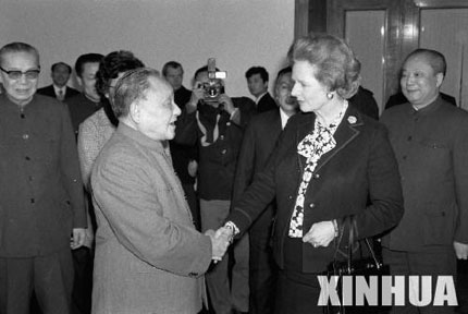 Chinese leader Deng Xiaoping shakes hands with visiting British Prime