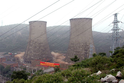 Two cooling towers are seen before their demolition in Huaibei, East China'sAnhui Province June 22, 2007, as part of the province's pledge to reduce resource consumption and obtain energy conservation. [Xinhua]