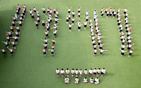 Primary school students line up to form characters "1997" at a school in Nanjing, East China's Jiangsu Province June 21, 2007 in celebration of the 10th anniversary of Hong Kong's return to China. All these students are born in 1997. [newsphoto] |