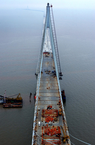 The bridge across the Hangzhou Bay in East China is seen under construction on June 26, 2007. The 36-kilometer (22-mile) bridge that its builders claim is the world's longest sea-crossing structure was formally linked-up Tuesday just south of Shanghai.[Xinhua]