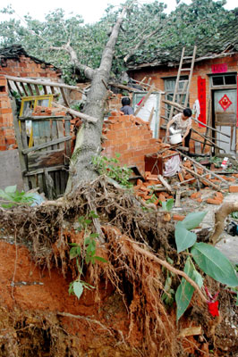 A tree is uprooted and falls on the roof of a house as two residents transport household items after a rainstorm in Shangrao, East China's Jiangxi Province June 25, 2007. Nine counties in Shangrao were stuck by lightning, strong gale and hail, killing 16 residents. Among the dead, 14 farmers were killed by lightening while toiling on farmland and two by collapsed houses. [Newsphoto]