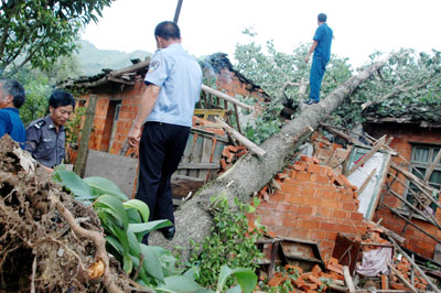 Law enforcement officers survey the site after a rainstorm in Shangrao, East China's Jiangxi Province June 25, 2007. Nine counties in Shangrao were stuck by lightning, strong gale and hail, killing 16 residents. Among the dead, 14 farmers were killed by lightening while toiling on farmland and two by collapsed houses. [Newsphoto]