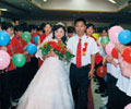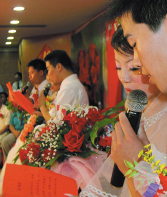 Three pairs of newlyweds pledge allegiance during a wedding ceremony in Tianjin Municipality June 28, 2007. [Xinhua]