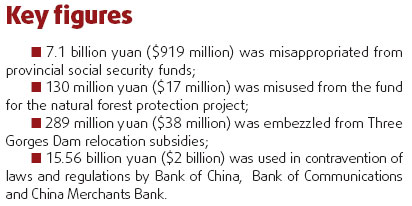 7 billion yuan misused, irregularities foundBy Zhu Zhe (China Daily)Updated: 2007-06-28 06:52 The nation's top auditor said Wednesday that embezzled or misappropriated central government funds cost taxpayers nearly 7 billion yuan ($919 million) last year, while more than 37 billion yuan ($4.86 billion) was poorly managed.