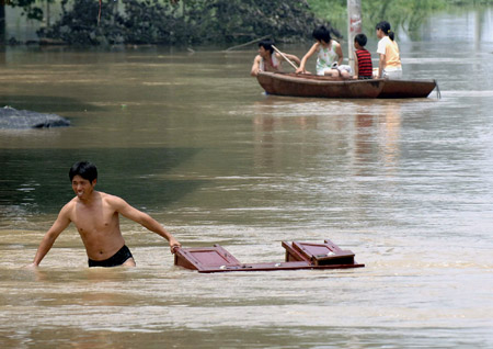 A local villager drags his furniture through the floods in Wangjiaba County, east China's Anhui province, July 11, 2007. Residents will get compensation from the government for their flooded home. [Reuters]