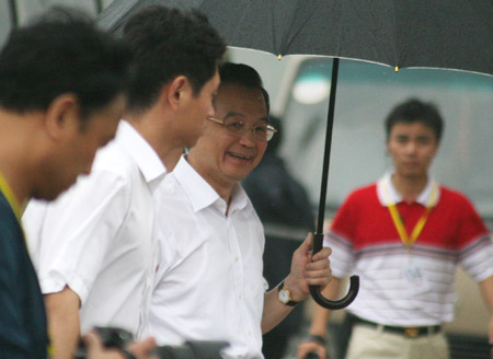 Chinese Premier Wen Jiabao (third from left) smiles during his visit to a the flood-hit Funan County in East China's Anhui Province, July 13, 2007. Continuous heavy rainfall has been battering a large part of eastern and southern China, with some parts witnessing the worst floods in decades. [newsphoto]