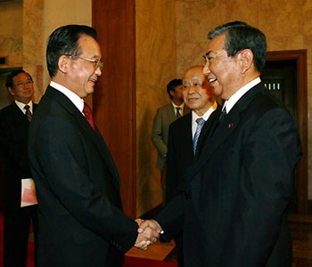 Chinese Premier Wen Jiabao (L Front) meets with Speaker of the Japanese House of Representatives Yohei Kono in Beijing, capital of China, on July 18, 2007. [Xinhua]