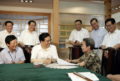 Chinese President Hu Jintao (center) chats with an elder woman in a