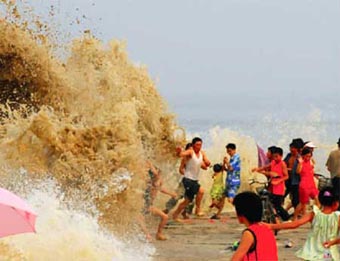 Qiantang River tidal has stroken down many of tourists while a wave hit a levee at the mouth of the river on Auguest 2,2007.[sina.com] |