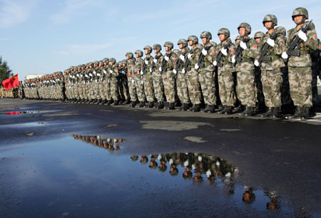 Soldiers stand at attention during a parade at a military base in Chelyabinsk of Russia August 11, 2007. [Xinhua]
