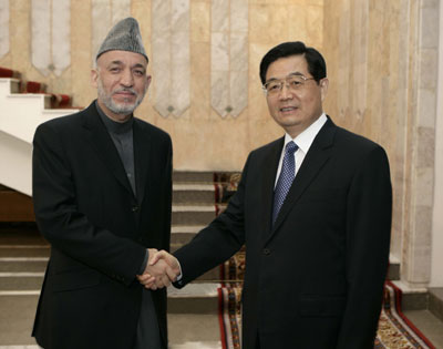 Chinese President Hu Jintao (R) greets his Afghan counterpart Hamid Karzai as they gather for the Shanghai Cooperation Organization Summit in Bishkek August 15, 2007. [Xinhua]