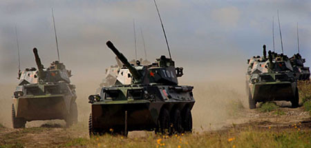Armoured vehicles advance in formation during the final stage of the Peace Mission 2007 counter-terrorism drill, sponsored by the Shanghai Cooperation Organization, in Chelyabinsk in Russia's Ural Mountains region, August 17, 2007. Leaders and defense ministers from SCO's six member countries gathered in the Chebarkul military range near Chelyabinsk in the morning to observe the drill, which is also due to end on Friday. [Xinhuanet]