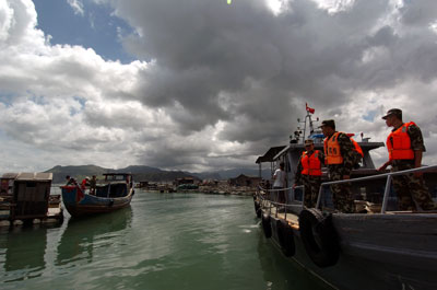 Updated: 2007-08-17 23:45 Maritime officers urge fishermen to evacuate before Typhoon Sepat makes landfall in Fuzhou, East China's Fujian Province August 17, 2007. China on Friday continued to order vessels to return to harbor and maritime workers to land, send warning messages and relocating people to safety as super typhoon Sepat approaches. [Xinhua] |