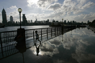 A boy plays near the Huangpu River in Shanghai August 17, 2007. China on Friday continued to order vessels to return to harbor and maritime workers to land, send warning messages and relocating people to safety as super typhoon Sepat approaches. [Reuters]